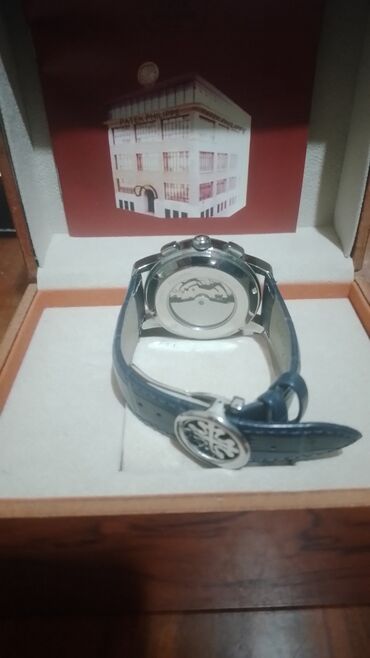 - Qolbaq: tünd mavi dəridən, tikişli; metal iynə qapağı üzərində Patek Philippe loqosu motivi.