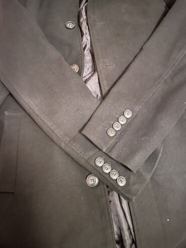 Kişi kaşmir palto - Rəng: qara - Kəsim: klassik, düz siluet - Uzunluq: dizə yaxın - Yaxa: klassik qatlanan yaxa - Bağlanma: ön hissədə düyməli (4 düymə görünür) - Ciblər: iki yan cib - Parça: qal...