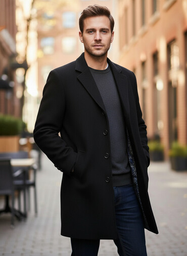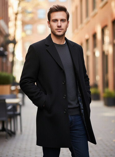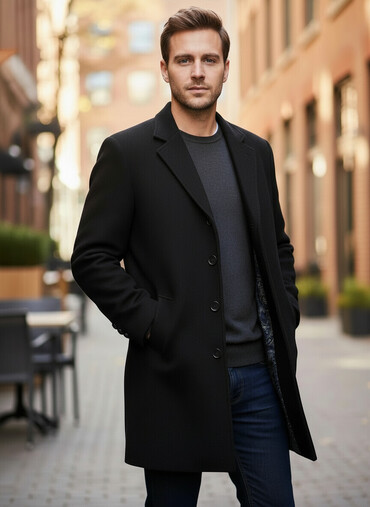 Kişi palto – qara rəng, klassik dizayn - Model: dizdən yuxarı