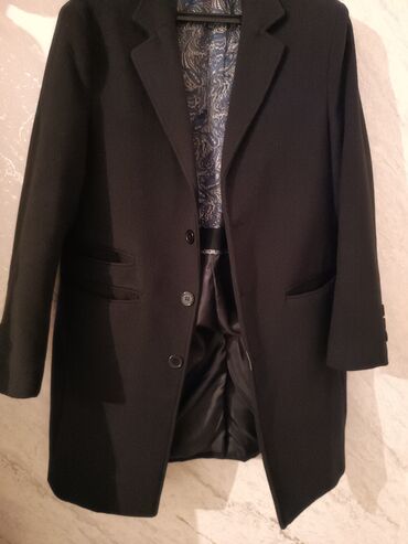 Kişi üst geyimi – qara rəngdə palto/kaban - Marka: Kamelot (etiketdə göstərilir), ölçü: S - Dizayn: minimal və klassik, yaxasız (standart boğaza yaxın dayanan) kəsim - Bağlanma: ön hissədə düyməli...
