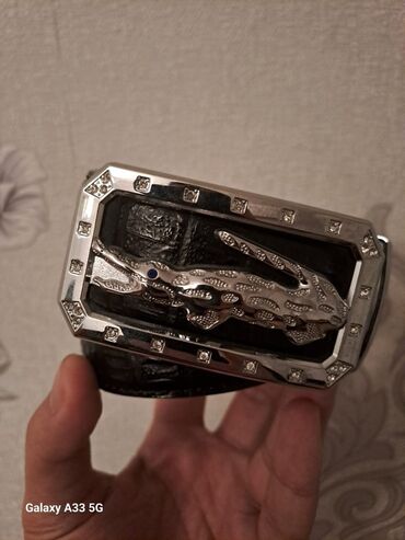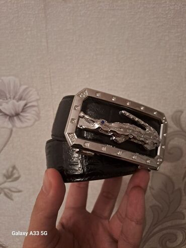 - Tokası: iri, çoxbucaqlı metal toka; üzərində kvadrat daş bəzəkləri və mərkəzdə relyefli timsah fiquru (göz hissəsində mavi nöqtə detallı). Parlaq xrom rəngli çərçivə ilə vurğulanıb.