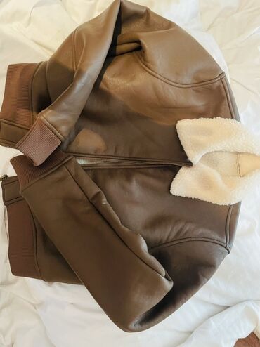 Qəhvəyi dəri görünümlü, içi süni qoyun yunlu (şerpa) bomber gödəkçə