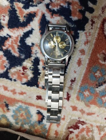 2) Gümüşü rəngli metal qayışlı saat (marka: FOSSIL üslubunda yazı görünür)