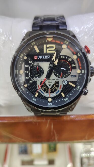 Curren kişi qol saatı – xronoqraf funksiyalı, idman-klassik üslub. - Korpus və bilərzik: qara rəngli paslanmayan polad - Rəng sxemi: qara zərif əsas, qızılı indekslər və sub-siferblatlar, qırmızı ...