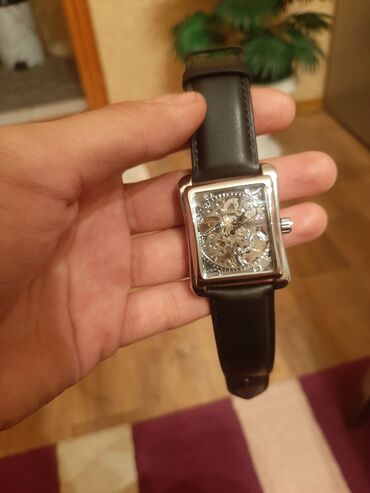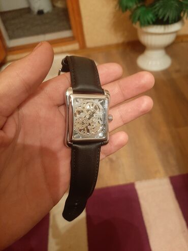 Kişi mexaniki qol saatı – kvadrat (yüngül əyri) korpuslu skeleton dizayn - Mexaniki (əl ilə qurulan) mexanizm – şəffaf skeleton siferblat vasitəsilə işləyən dişlilər görünür - Korpus: parlaq metal...