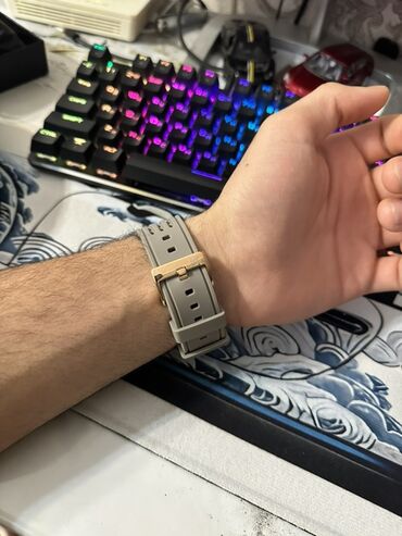 - Kəmər: boz rəngli silikon/kauçuk, çoxsıralı havalandırma dəlikləri, qızılı rəngli tokalı bərkidici.