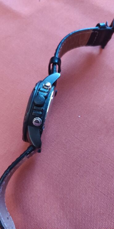 Kvars mexanizmlə analog-rəqəmsal kişi qol saatı - Korpus: mat qara metal, dairəvi forma, 3 tərəfli düymələr - Siferblat: qara rəng, fosforlu əqrəblər və indekslər; daxilində rəqəmsal ekran pəncərə...