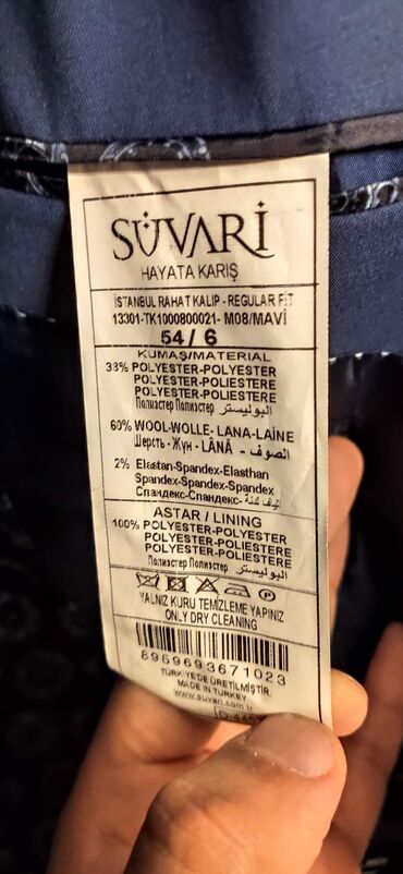 Geyim sifarişlə yeni alınıb gətirilib və sadəcə 44-0 ölçüsü uyğun gəlmədiyindən satılır. İki parçalı kişi kostyumu – qrafit boz rəngdə - Üst: ikicərgəli düymələmə, geniş haşiyəli (peak lapel) yaxa,...
