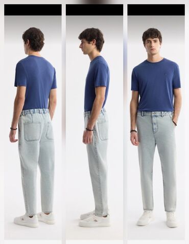 Mavi denim şalvar - Model: düz kəsim, yüksək belli görünüş - Rəng: açıq-orta mavi, yüngül “stone wash” effektli - Material: klassik qalın denim (pambıq əsaslı) - Arxa: iki kvadrat formalı arxa ci...