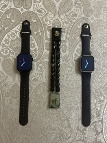 - Smart saatlar: kvadrat sensor ekran, qara/smoki rəngli silikon qayış, yan düymə. Ekranda klassik ox göstəricili watchface.
