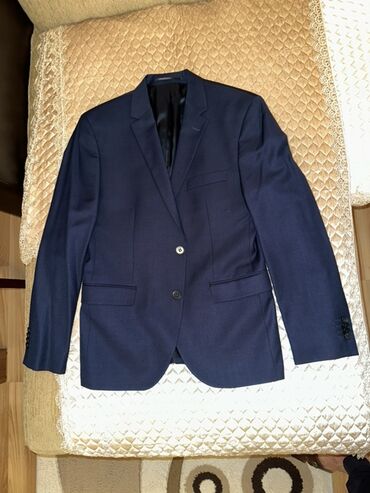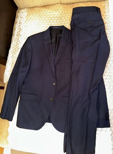 Kişi üçlü kostyum dəsti - Rəng: tünd göy (navy) - Dəst: pencək + ikicərgəli jilet + şalvar (şəkildə pencək və jilet görünür) - Pencək: 2 düyməli, yan cib qapaqları, sinədə bəndli cib, klassik yaxa...
