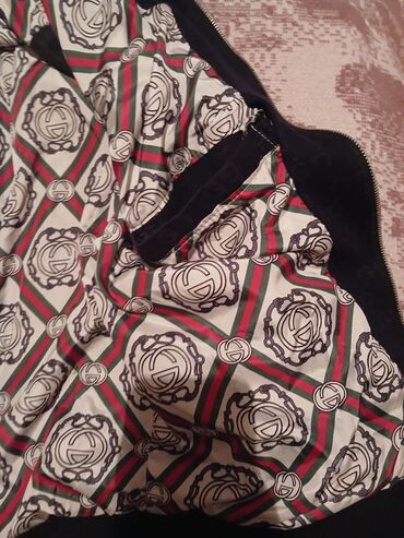 - Daxili astar: ağ fon üzərində yaşıl‑qırmızı zolaqlar və dairəvi monoqram motivləri ilə naxışlı parça