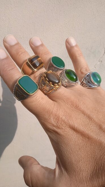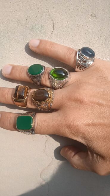Kişi üzük kolleksiyası - Material: əsasən metal karkas (gümüş tonlarında), bəzilərində naxışlı və oyma detallı gövdə. - Daşlar: - Firuzə (göy) oval kəsim, hamar səthli, sadə və enli kənarlı haşi...Giriş•Qeydiyyat