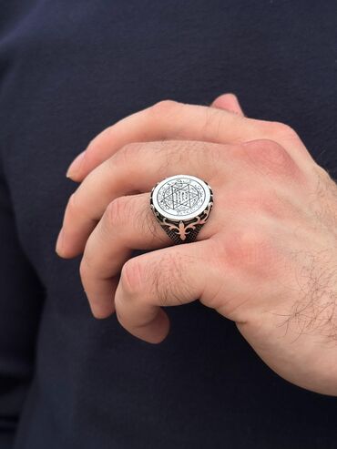 Gümüş kişi üzüyü - Material: gümüş rəngli metal ərintisi (üzərində dekorativ naxışlar). - Dizayn: klassik möhür üzüyü forması; yan hissələrində relyef ornamentlər və simvolik təsvirlər. - Mərkəz d...