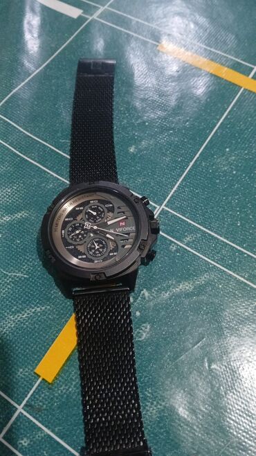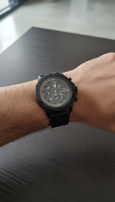 İdman və gündəlik stilə uyğun, çoxgöstəricili analoq paneli və metal mesh kəməri ilə diqqətçəkən model. 30 metr suya davamlılıq qeyd olunub, tarix/gün və 24 saat göstəriciləri yer alır.