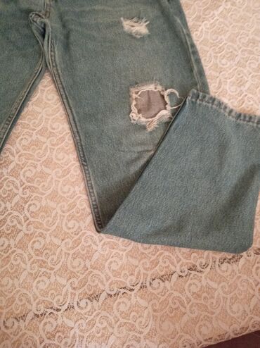 ZARA kişi cins şalvarı - Model: Açıq göy rəngli denim, düz kəsim (wide/relaxed fit görünüşü) - Material: 100% pamuk denim (etiketdən) - Rəng/effekt: Yüngül yuma və solğun effektli vintage görünüş ...