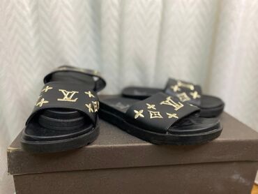 Qara rəngli slayder tipli kişi/kadın sandaleti - Material: Sintetik dərili üst hissə, yumşaq içlik, elastik rezin altlıq - Dizayn: Qızılı rəngdə naxışlı monoqram motivləri ilə geniş üst kayış - Rə...