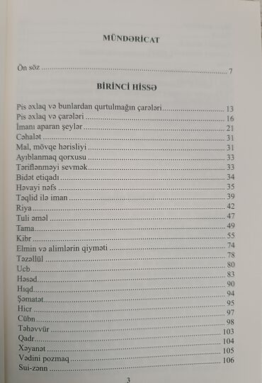 - Birinci hissə: pis əxlaq və ondan qurtulma yolları; imanı aparan hallar; cəhalət; mal-mövqe hərisliyi; ayıblanmaq qorxusu; təriflənməyə meyl; bidət; nəfsani meyllər; təqlidlə iman; riyakarlıq; uzun-ömür arzusu; tamah; kibir; elmin və alimlərin qiyməti; təzəllül; ucb; həsəd; huqd; şamatat; hicr; cübn; təhəvvür; qadr; xəyanət; vədini pozmaq; sui-zənn; mala məhəbbət; təsvir; fasiqləri sevmək; alimlərə düşmənlik; fitnə; müdahanə və müdarə; inad və mükabərə; nifaq; təfəkkürsüzlük; müsəlmana qarşı olmaq; pis ad qoymaq; üzrü rədd etmək; Qurani-Kərimi səhv təfsir etmək; haramda israr; qeybət; tövbəni tərk; “Çox mühüm izah”