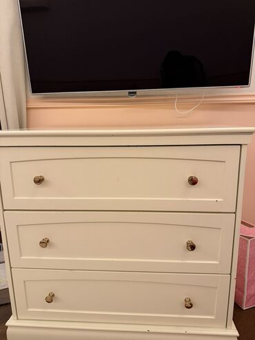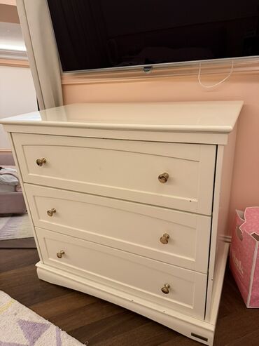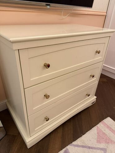 Klassik üslubda krem rəngli komod/şkaf. - Korpus: taxta əsaslı material, dekorativ panelli ön səthlər - Rəng: açıq krem, qızılı detallı tutacaqlar - Ölçü təxmini: orta hündürlük, 1 metrə yaxın en ...