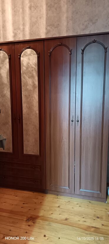 Mebel dəsti – 4 qapılı güzgülü paltar şkafı - Model: 4 qapılı, ortası iki ədəd güzgülü qapı - Rənglər: açıq krem və ağac teksturalı (palıd tonları) - Daxili quruluş: - Geniş asılqan bölməsi - ...