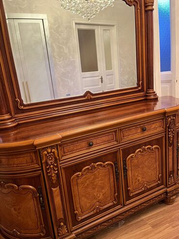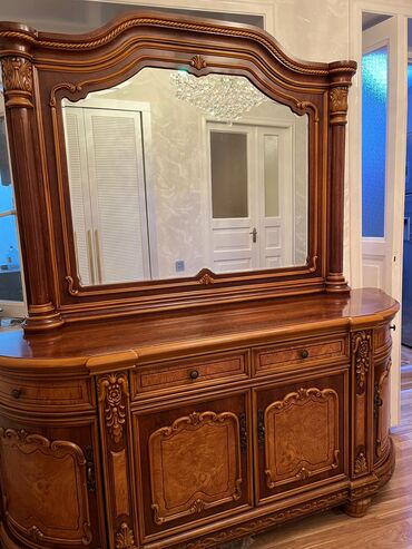 Klassik üslubda massiv taxtadan vitrina-komod və iri güzgü dəsti. - Material: keyfiyyətli taxta, təbii ağac naxışları - Üslub: oyma dekorativ elementlər, ornamentli çərçivə və pilastrlar - Üst his...
