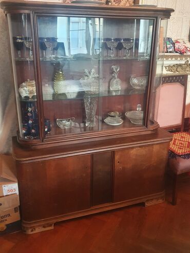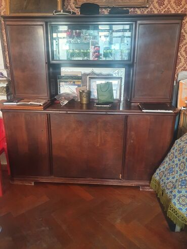 1) Üstü şüşəli mərkəzi vitrin bölməsi və hər iki yanda qapalı şkafları olan geniş bufet. Aşağı hissədə iri qapalı saxlama bölmələri mövcuddur.