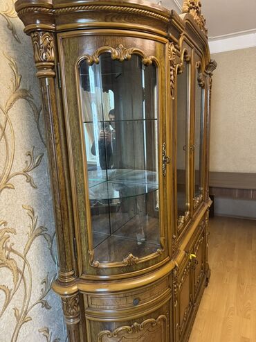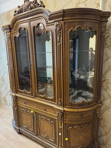 Klassik üslubda vitrin-bufet - Material: massiv ağac karkas, oyma dekorlar, laklı təbii ağac örtüyü - Üst hissə: 3 şüşə qapılı vitrin, içəridə şüşə rəflər və arxa güzgü panellər - Alt hissə: 3 qap...
