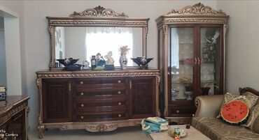 Klassik üslubda qonaq otağı mebel dəsti Komplekt: - Vitrin şkaf: Oval şüşə vitrinli, içəridə şüşə rəflər; dekorativ oyma detallı çərçivə, üst hissədə naxışlı bəzək xətti. - Komod + böyük oval güzg...