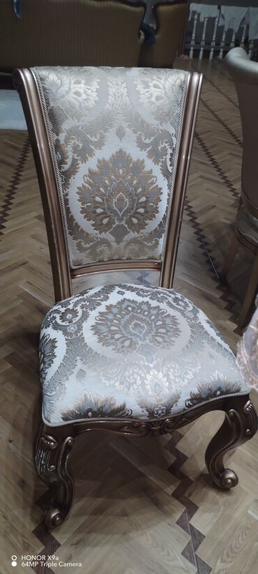 Klassik üslubda yemək otağı dəsti Tərkibi: - Geniş yemək masası: oyma ayaqlar, hamar parlaq səth. - 6 ədəd stul: yumşaq oturacaq və bel hissəsi, naxışlı parça üzləmə, əyri klassik ayaqlar. - Bufet...