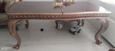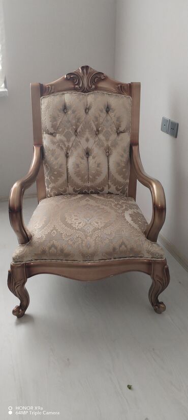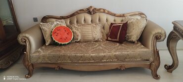 Klassik üslubda qonaq otağı mebel dəsti - Rəng: açıq krem, qızılı dekor elementləri ilə - Üslub: klassik/royal, oyma ornamentli üst taxtalar və dekorativ ayaqlar - Material: laminat/MDF əsaslı kon...
