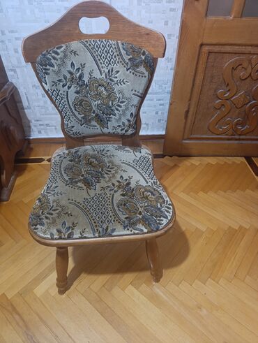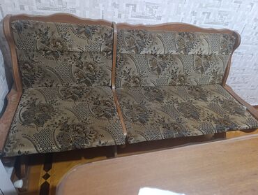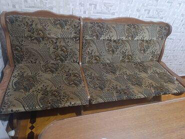 - 2 nəfərlik oturacaq: Taxta karkaslı, qıvrım formalı yanlıqlar və bel hissəsi ilə. Parça üzlük bej-qəhvəyi tonlarda, güllü naxışlıdır. Oturacaq və söykənəcək bir-biri ilə uyğun şəkildə yumuşaq süngərlə doldurulub. Mətbəxə, dəhlizə və ya qonaq otağına uyğun ölçüdə kompakt dizayn.