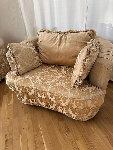 - Ölçü təəssüratı: Divan geniş və uzunsov formadadır, kreslo isə iri ölçülü, dərin oturuşludur (şəkillərdə miqyasa baxın)