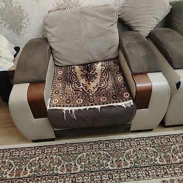 Klassik üslubda 2 parçalı oturma dəsti: - 3 nəfərlik divan + 1 ədəd kreslo - Rəng: bej parça oturacaq və arxalıq, qəhvəyi süni dəri (eko‑dəri) qol dayaq və baza - Sadə, düz xətli dizayn; geniş və d...