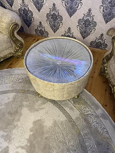 Möhtəşəm yumşaq mebel dəsti – 990 AZN Tərkibi: - 1 ədəd 3 nəfərlik divan - 2 ədəd kreslo - 1 ədəd dairəvi sehpə (ağ mərmər naxışlı üst, qızılı metal baza) Xüsusiyyətlər: - Zərif, krem rəngli nefe...