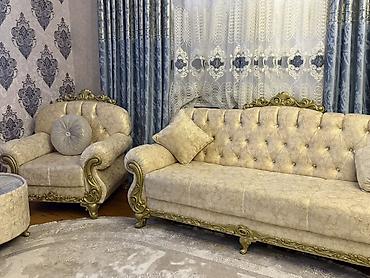 Klassik üslubda yumşaq mebel dəsti - Tərkib: 1 ədəd geniş divan, 2 ədəd bərabər ölçülü kreslo, 1 ədəd mərmərə bənzər üstlü qoltuq-altı/çay masası. - Dizayn: Barokko motivli qızılı oyma dekor, kapi...
