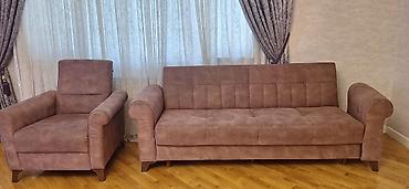 - Ölçü təəssüratı: Divan təxminən 3 oturacaq yeri; kreslo geniş tək oturacaqdır