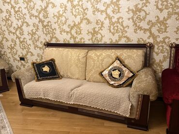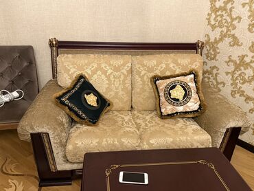 - Divan: İki oturacaqlı, geniş yumşaq qol dayaqçıları. Arxa və oturacaq hissələri iri naxışlı parça ilə. Üstündə dekorativ kvadrat yastıqlar.