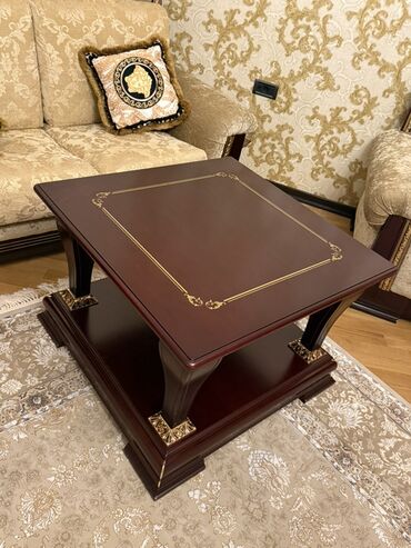 - Jurnal masası: Tünd qəhvəyi parlaq səth, künclərdə dekorativ metallik bəzəklər, aşağıda əlavə rəf. Üst hissədə zərif qızılı konturlar.