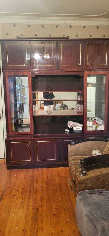 - Konstruksiya: üç hissəli üst dolab bloku (qapalı bölmələr), ortada geniş ekspozisiya sahəsi güzgülü arxa panel və şüşə rəflərlə