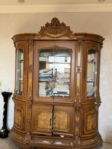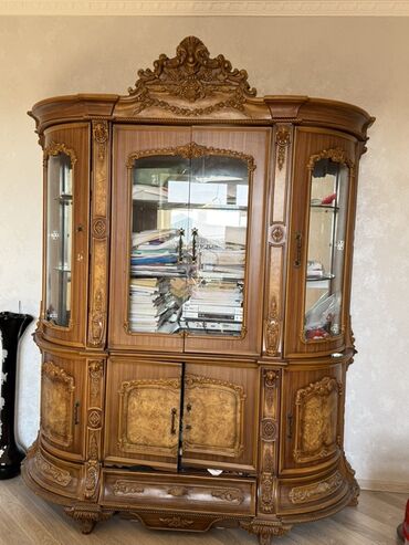 Klassik üslubda ağır taxta vitrin şkaf dəsti - Material: Təbii ağacdan hazırlanmış korpus, oyma dekor və bürünc rəngli aksesuarlar - Üslub: Klassik/rokoko elementli fasad, yuxarı hissədə taclı kar...
