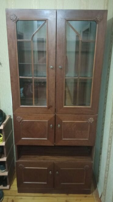 Vitrinli bufet şkaf - Material: ağac (tünd qəhvəyi ton), klassik dizayn - Ön hissə: iki ədəd şüşəli qapı, dekorativ metal tutacaqlar - Daxili quruluş: bir neçə rəf – qab-qacaq, suvenir, saat və di...