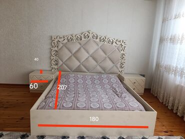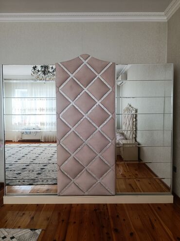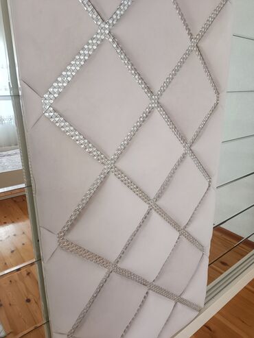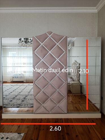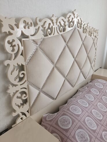 - Çarpayı: krem rəngdə, geniş başlıqla. Başlıq yumşaq kapitonaj (romb naxışlı) üzlüklə və parlaq dekorativ haşiyələrlə işlənib; oyma ornamentli çərçivə.