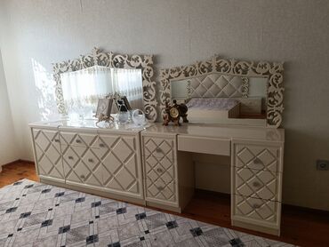 Zərif klassik üslubu, güzgü komplekti və bol saxlama yeri ilə harmonik yataq otağı həlli.