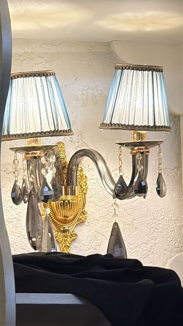 - Abajurlar: iki ədəd, açıq mavi/boz çalarda pliseli parça, kənarları bəzək lentli
