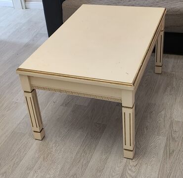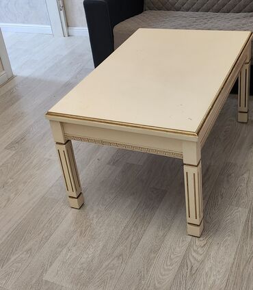 Ağ rəngdə salon/otaq üçün oturacaq qarşısı jurnal masası. Xüsusiyyətlər: - Üst hissə: qalın şüşə panel (mərkəzdə düz, kənarlarda dekorativ haşiyə). - Korpus: krem-ağ rəngli, klassik xətli dizayn. ...