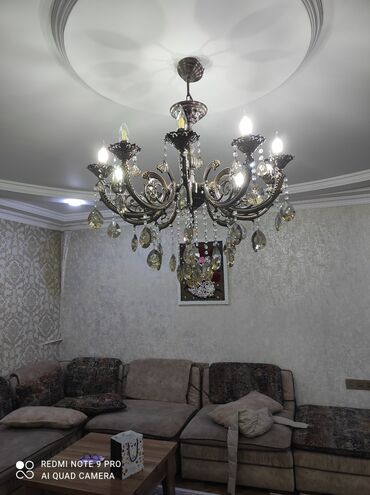 - Dizayn: 8 şamformasına bənzər lampa yuvası, dekorativ naxışlı qollar, müxtəlif ölçülü damla kristallar və zəncirli asmalar