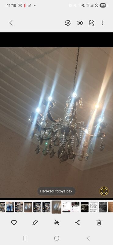 - Dizayn: çoxqollu konstruksiya, hər qolun üzərində dekorativ kasalar və kristal damcılar; mərkəzdə asma bəzəklər və zəncirli asma