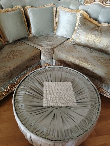 - Komplekt: L formalı künc divan + dairəvi puf/çay masası (şüşə üstlü)