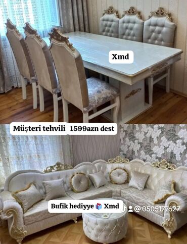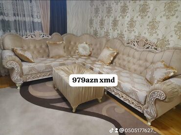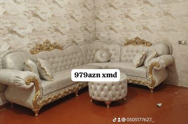 Klassik üslubda yumşaq mebel dəsti – künc divan və puf/masa kombinasiyaları.