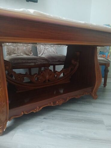 Klassik üslubda masa və 6 stul - Material: təbii ağacdan hazırlanmış massiv masa və 6 ədəd stul - Üslub: oyma dekorlu klassik/neo‑barok elementlər, zərif konturlar - Rəng: tünd qoz çaları, laklı p...